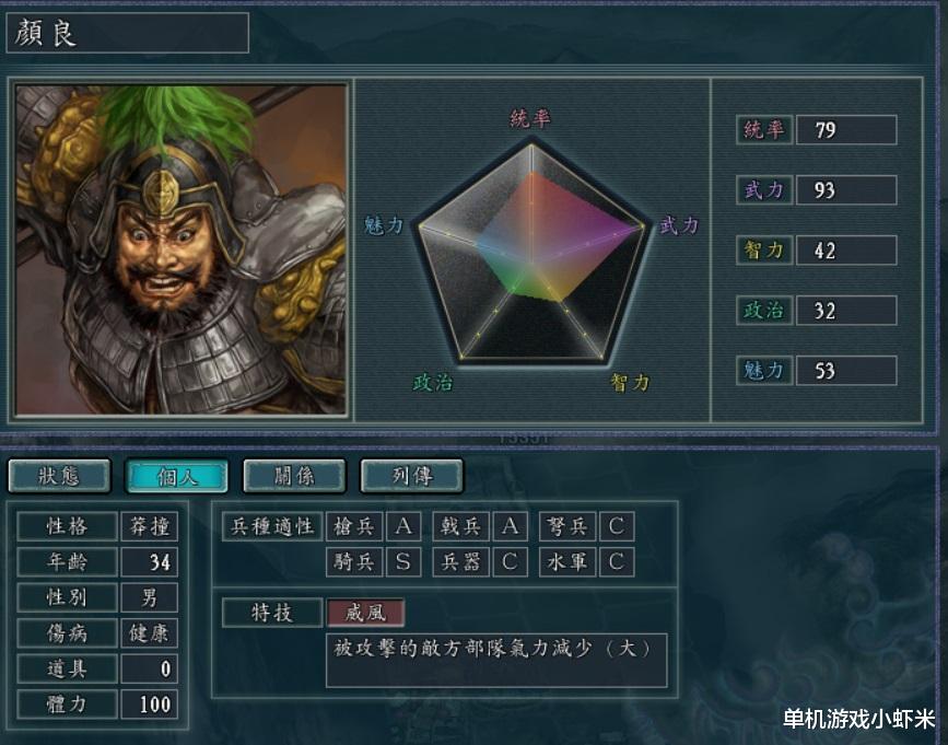 3,颜良。和张辽一样的特技,每次攻击敌人掉20气力,智商是硬伤,建议配个好军师。