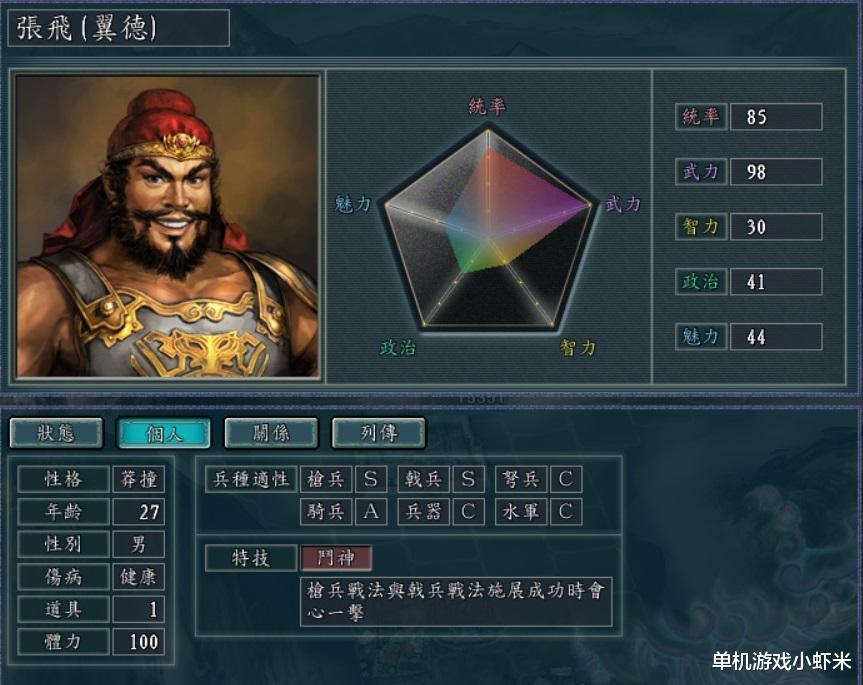 2,张飞。枪兵、戟兵S,特技施展成功后会心一击。很强。智商是硬伤。