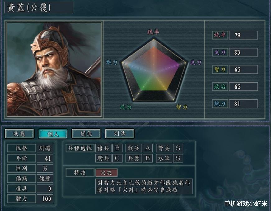 5,黄盖。弩兵和水军S,特技火攻,对智力低的人施展火计必定成功,但是自身智力才65,很尴尬。