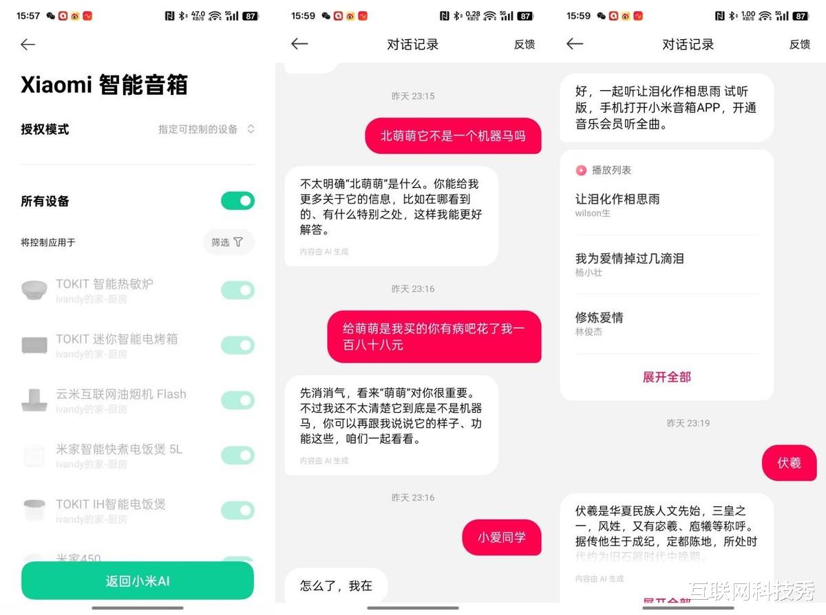 配置连网的过程就不多说了,米家APP和小米音箱APP都是一扫就行。重点是这个"小爱同学"——注意啊,不是以前那个机械复读机,是真·AI大模型加持的版本。