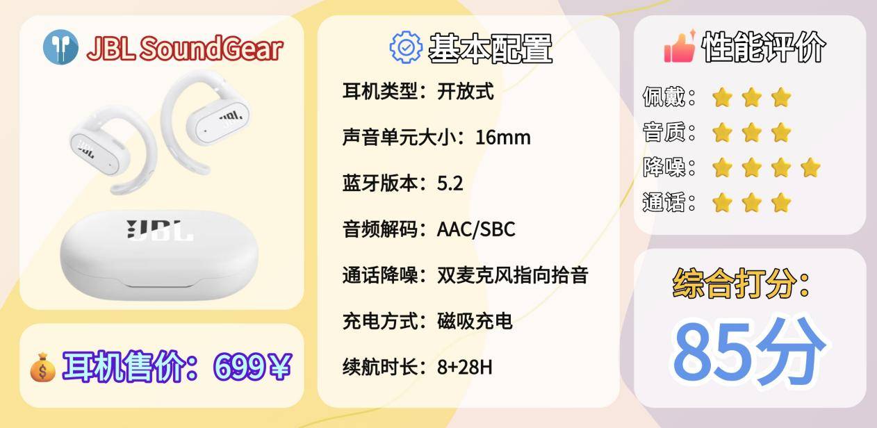 在声音表现上,SoundGear Sense 配备了 16.2mm 定制动圈单元,并结合轻量复合振膜和 JBL 自研低频增强算法,经过专业声学团队调音,能够在低、中、高三个频段都保持相对均衡。低频富有弹性,中频饱满,人声清晰,高频自然延展,整体风格耐听不疲劳。开放式定向声场技术有效减少声音扩散,同时降低环境噪声干扰,让听感更加沉浸。