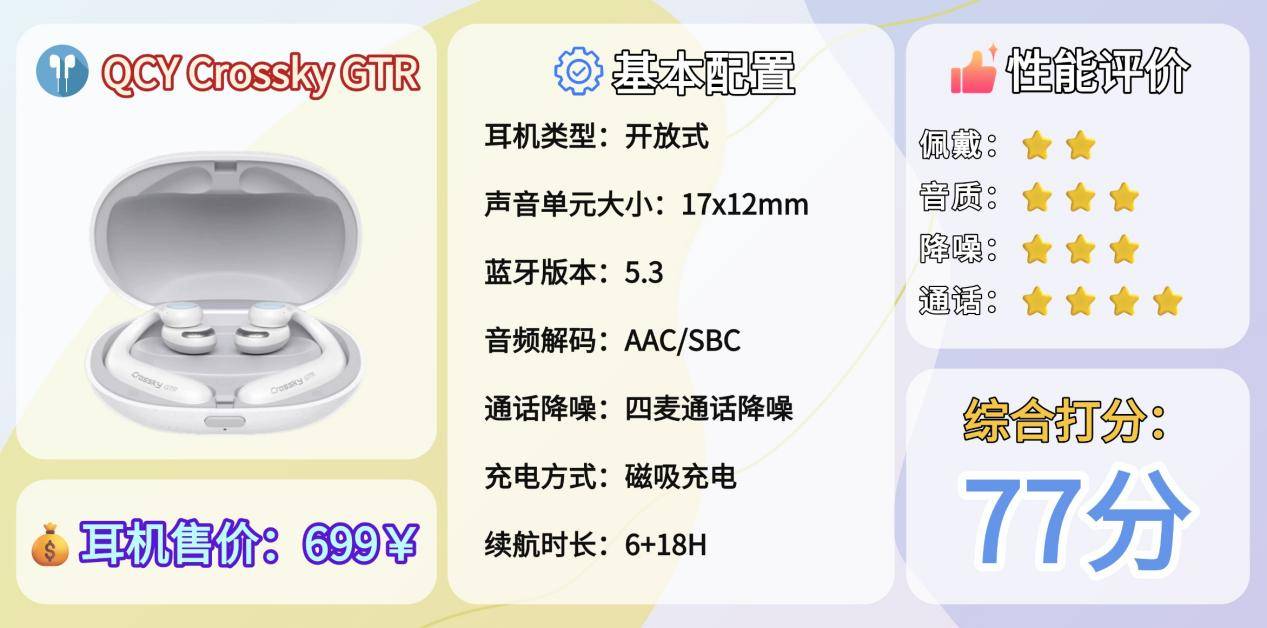 续航能力处于中等水平,单次可播放约 6 小时,配合充电盒可延长至 24 小时。蓝牙 5.3 提供了稳定的连接和较低的延迟。综合来看,Crossky GTR 更偏向高性价比路线,适合预算有限但仍想要在音质与佩戴舒适度上获得良好体验的用户。