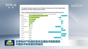 央视网消息(新闻联播):世界知识产权组织6日公布交通领域发展趋势最新报告。报告称,统计显示,中国在相关专利发明国家排名中居于首位,日本、美国、韩国和德国分列第二至第五位。五国相关专利发明数量全球占比达到90%以上。报告还称,2018年至2023年,中国在未来交通技术专利发明领域的复合年均增长率也居于世界首位,达到14.3%。同时,中国在陆、海、空及太空交通所有四个领域的专利发明数量和增长方面也处于世界领先地位。