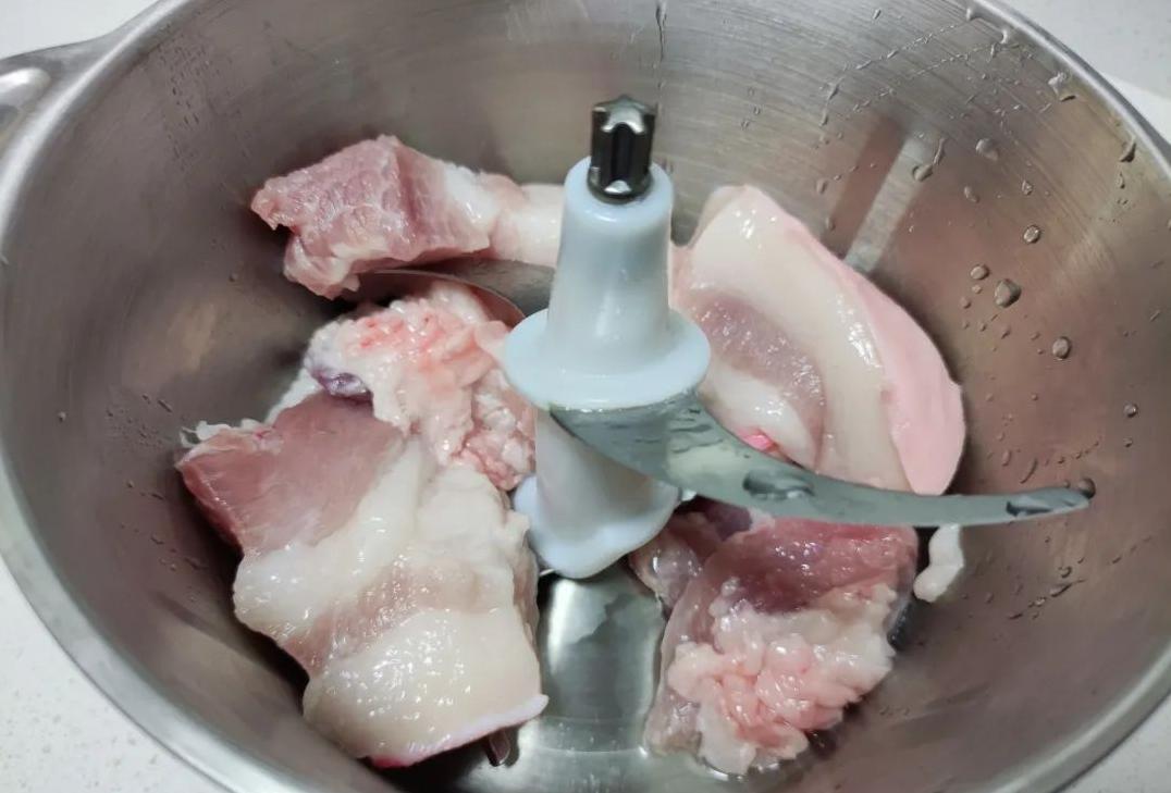 腿肉呢,先洗净切块,再放进绞肉机和香菇一起搅成泥。