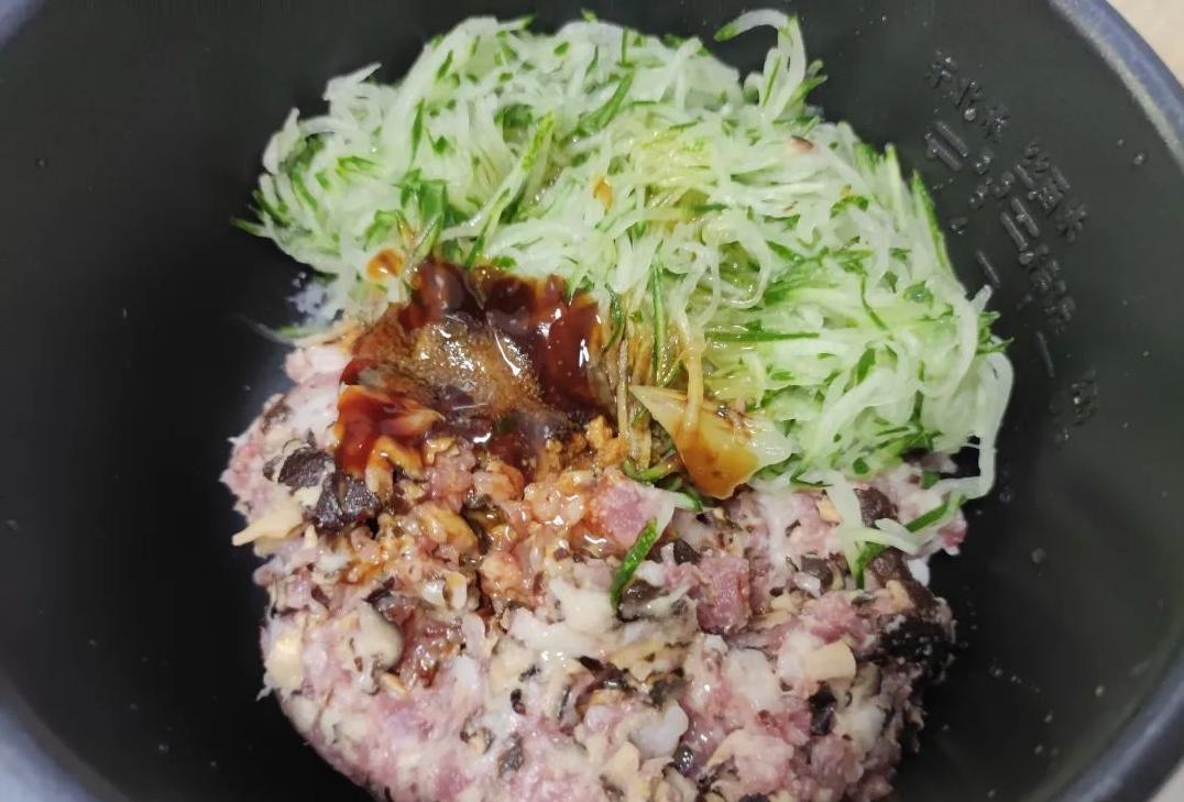 接下来,将腌好的黄瓜丝挤干水分,放入肉馅中,加入食盐、蚝油、酱油和香油,搅拌均匀。