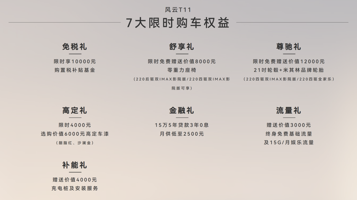 现在购买风云T11即可享受7大限时购车权益,其中包括限时享10000元购置税补贴基金;限时免费赠送价值8000元零重力座椅;限时4000元选购价值6000元高定车漆;15万5年贷款3年0息,月供低至2500元;终身免费基础流量等,入门款车型限时购置税补贴价仅17.99万元。