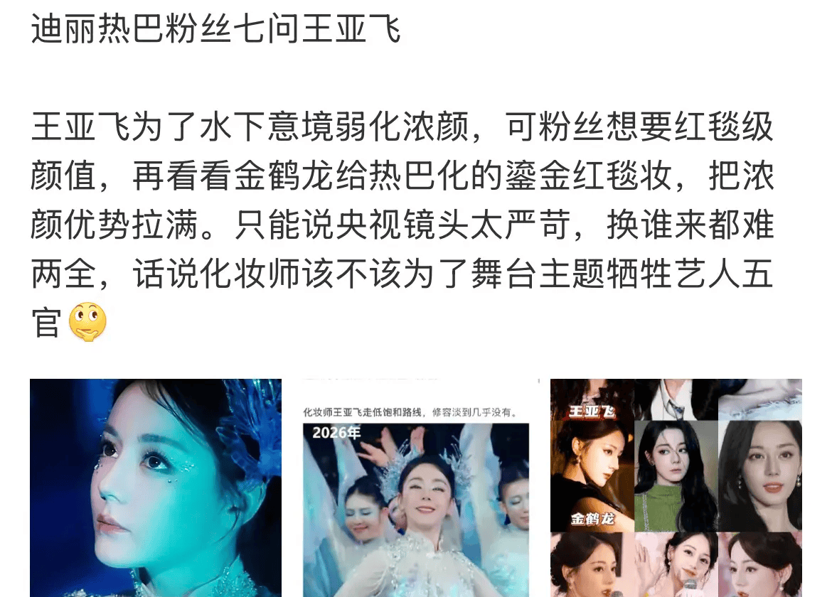 粉丝的不满在这一刻彻底爆发,连夜整理出一份堪称檄文的七问,直接将王亚飞推上了舆论风口。这七问字字戳中核心,从为何始终弱化迪丽热巴标志性的眉眼优势,到修容失当让立体五官变得扁平,再到屡次无视粉丝建议坚持模板化妆,每一个问题都指向了王亚飞长期以来的无效化妆操作。在粉丝看来,这次春晚的妆容翻车绝非偶然,而是化妆师失职,甚至阴谋论他和别人勾结,故意这么恶搞迪丽热巴。