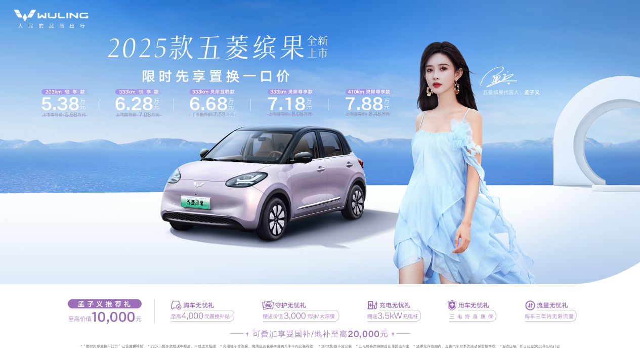 2025款五菱缤果共推出203km轻享款、333km悦享款、333km灵犀互联款、333km灵犀尊享款及410km灵犀尊享款五款配置可供选择,官方指导价为5.68万-8.48万元,为庆祝五菱缤果家族销量突破五十万,特推出感恩回馈:购2025款五菱缤果可享限时先享置换一口价5.38万-7.88万元。此外,五菱官方推出至高价值10,000元的“孟子义推荐礼”,包括购车无忧礼:至高4,000元置换补贴;守护无忧礼:赠送价值3,000元3M太阳膜;充电无忧礼:赠送3.5kW充电桩;用车无忧礼:三电终身质保;流量无忧礼:购车后享受三年无限流量;此外还可叠加享受至高20,000元的国家/地方补贴。广大用户可通过五菱汽车APP/小程序等线上渠道下订。