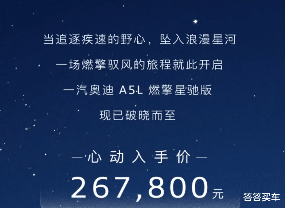 答答点评:在售的一汽奥迪A5L基于奥迪PPC豪华燃油智能平台打造,在智能、空间方面有很大提升。一汽奥迪A5L目前有5款车型在售,其中的乾崑智驾版搭载由华为提供的驾驶辅助系统,对智驾要求高的用户可选择乾崑智驾版,对四驱有需求的用户可选运动版quattro版本。新增的燃擎星驰版主要针对配置进行了升级,车内的银河星空顶与劳斯莱斯的星空顶并不是一个概念,感兴趣的用户可到当地的4S店实地看车,亲身感受一下。