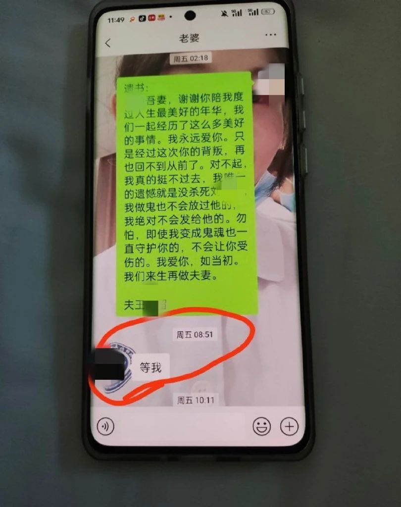 毛玲颖的手机收到了一条丈夫王超留给她的遗言:“我爱你,如当初,来生我们再做夫妻。”