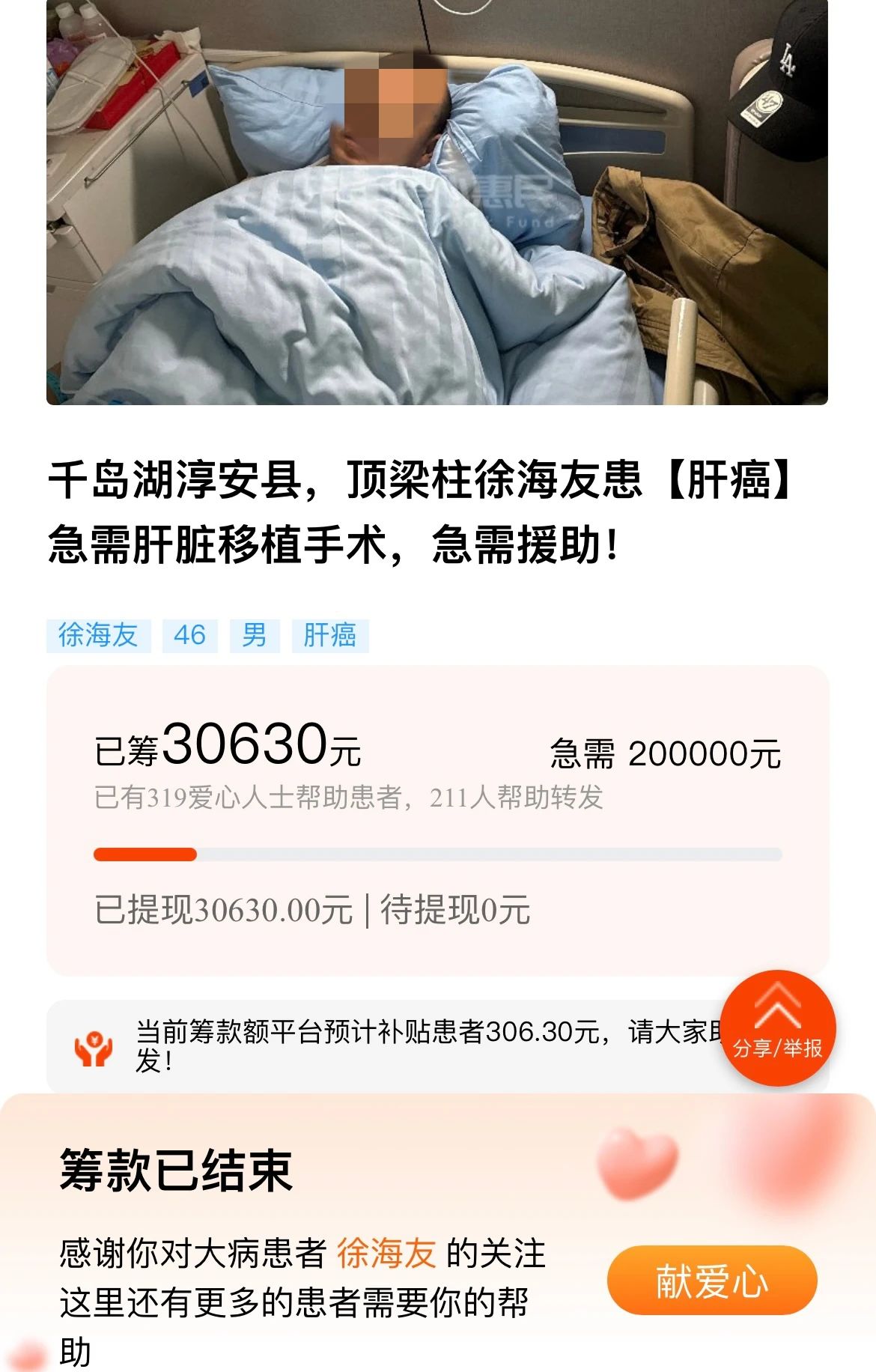 徐先生此前因儿子王某“妻子出轨致夫自缢”一案,向法院起诉了插足儿子婚姻的第三者刘某某,该案于今年4月初进行庭前会议,被告本人未到场,委托律师应诉。4月9日,徐先生表示自己身体情况不太好,难以接受采访;4月14日,他向记者转发筹款链接,称急需进行肝脏移植手术,需要20万元。5月22日,记者发现筹款已停止,徐先生最终筹得3万多元。