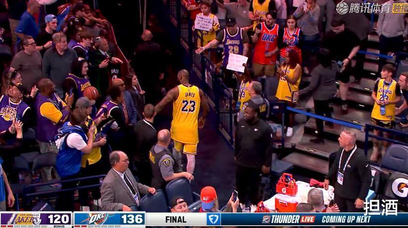 比赛结束,老詹没有停留,直接转身走入球员通道,在通道上和两边球迷击掌互动,虽然输了球心情不好,但是对球迷还是很友好的。