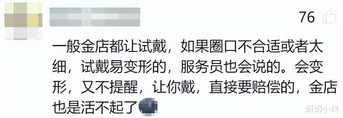 还有网友认为,一般来说,金店都让试戴的。要是镯子圈口不合适或者太细,试戴容易变形,服务员都会提前说一声的。