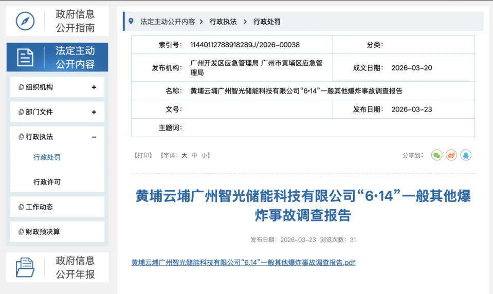 同一天,广州黄埔区公布了一份沉甸甸的事故调查报告。2024年6月,智光储能公司一名员工在测试磷酸铁锂电池包时,电池热失控,可燃气体瞬间闪爆。人没了,168万的损失也追不回来了。