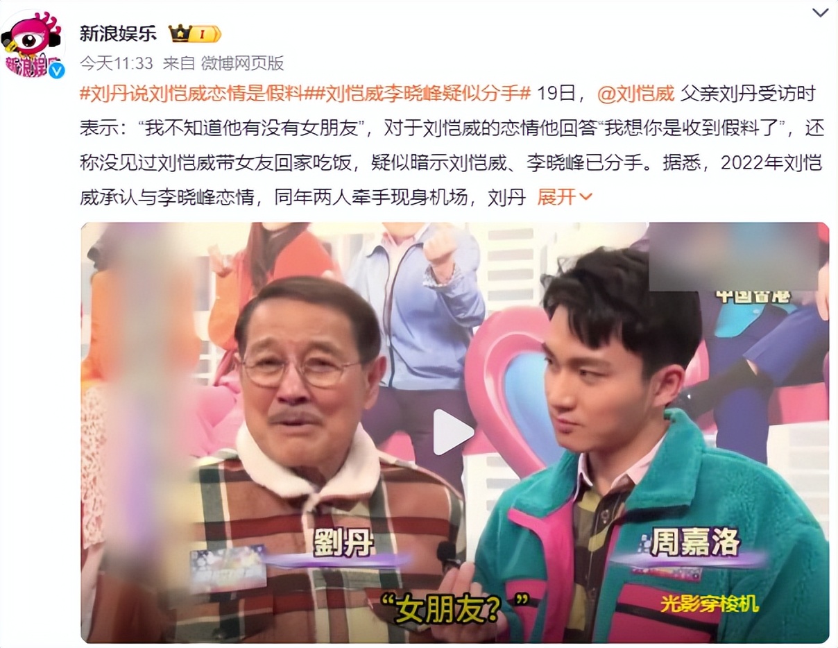 12月19日,刘恺威的父亲刘丹在出席活动被问到:儿子会在冬至带女朋友吃饭吗?没想到刘旦竟然回复说他并不知道儿子有女朋友,还表示记者是收到了假料。