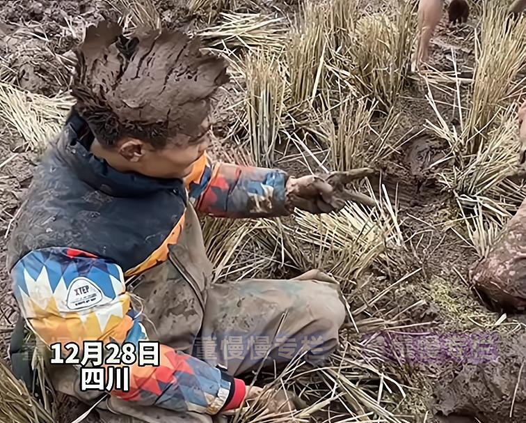 事情发生在四川一农村里,4名小伙在稻田里玩耍,丝毫不怕冷,也不嫌弃泥土脏。