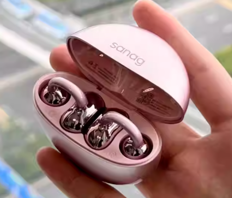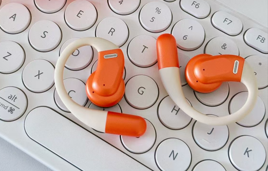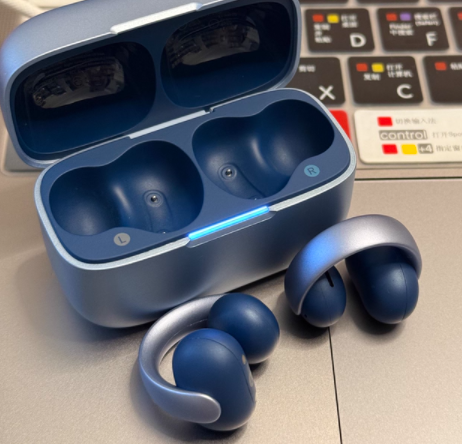 佩戴体验:单耳仅重5.9g,是做了超轻量化设计的,C 型弧耳夹夹角经过人体工学优化,内置可弯折记忆结构,搭配柔性记忆钛丝与亲肤液态硅胶材质,既能精准适配不同耳型,又能兼容眼镜佩戴