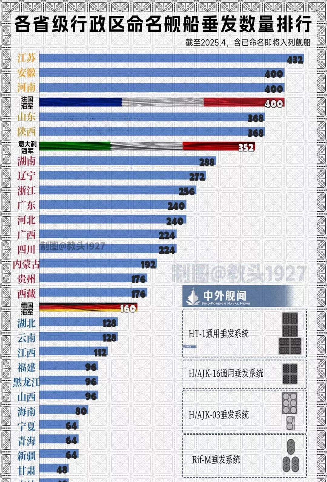 这其中仅导弹垂直发射单元就有408个!什么HL,什么FLB,一个“河南省分队”应对足矣;甚至已经超过整个法国海军的“垂发”数量!位居全国各省“垂发”持有量的第二位!远超意大利海军的352个和德国海军的160个。