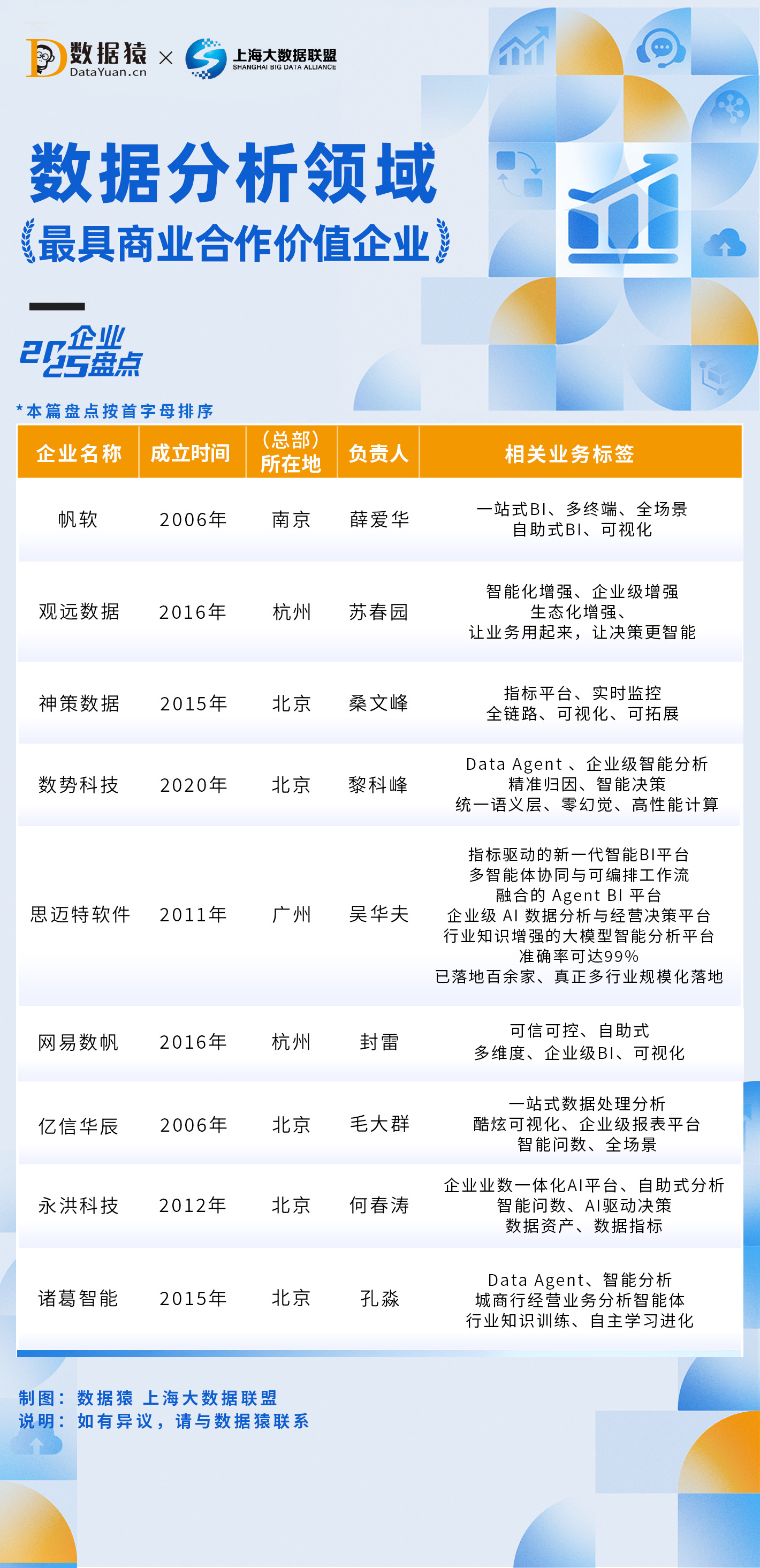 本期盘点列举了数据分析领域里的一些成熟玩家,主要涵盖企业相关产品及服务介绍、相关荣誉、代表性客户评价等,希望能为读者提供新角度的行业理解。
