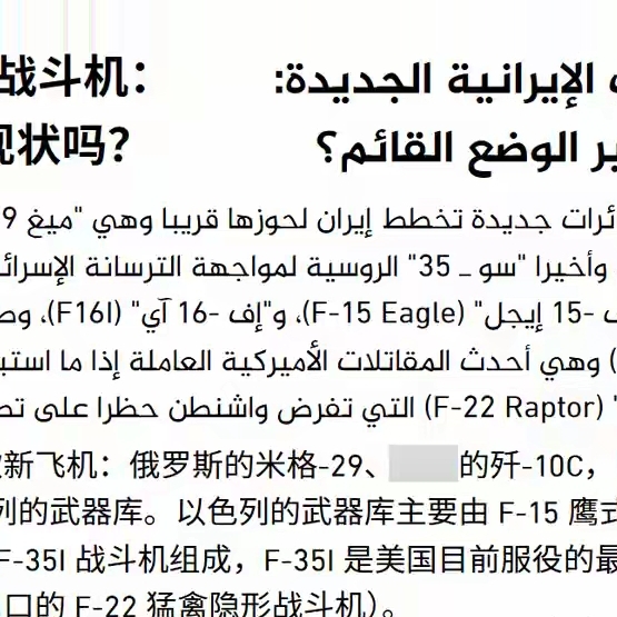 伊朗被美国和以色列打压多年,现在需要采取实质性行动,中俄都不会听任伊朗被打压,愿意出手相助,现在是伊朗接受帮助的最佳时候。以色列也并非“不可战胜”,伊朗本质是防御作战,在家里进行防御,占了很大的优势,只是以前没有防备,吃了大亏,如今痛定思痛,当有很大的改观。更不要过度夸大以色列的情况,以色列空军对伊朗本土的轰炸,依赖的是老旧的F-16与F-15战斗机,仰仗空中加油机的支援,伊朗只需用少量的先进战术战斗机,猎杀加油机,可以有效地限制以色列战斗机的行动。现在伊朗已从以伊冲突恢复过来,正在弥补自身的不足,如果再拖下去,伊朗的防御体系不仅会恢复,还会更强。留给以色列的时间就不多了。以伊冲突只是停火,以色列一直动口威胁打击却不采取行动,后果就是留给以色列时间不多了,伊朗正在加紧备战工作。在2025年11月8日,中东媒体《半岛电视台》报道称,伊朗计划要购买几百架歼-10和苏-35战斗机,还要打包引进红旗-9防空系统。伊朗将采购下一代战斗机(《半岛电视台》报道截图)