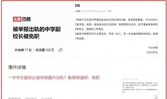 湖南宁乡市教育局12月23日通报,关于举报宁乡市某中学谢某某违反生活纪律的问题,教育局高度重视,于2024年11月对举报事项立案审查。