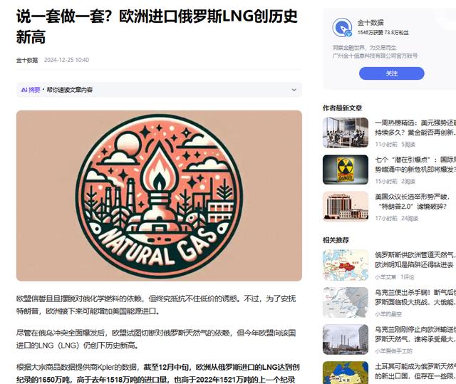 信息来源:金十数据 2024-12-25 说一套做一套?欧洲进口俄罗斯LNG创历史新高