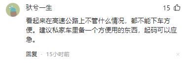 还有网友表示,高速公路不管是什么情况,都不能轻易地下车方便,车里应该备用一个可以方便的东西应不急之需。