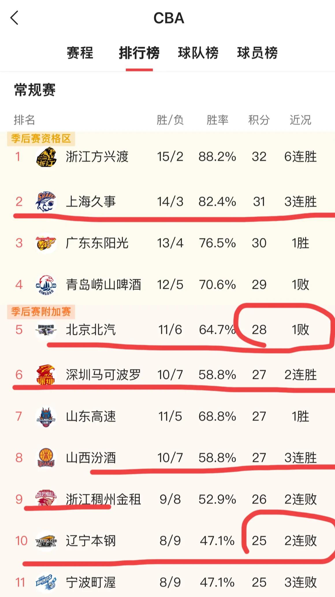 随着深圳男篮战胜浙江男篮,目前,深圳男篮是10胜7负的战绩排在第6名,而浙江男篮则是9胜8负的战绩排在全联盟的第9名。