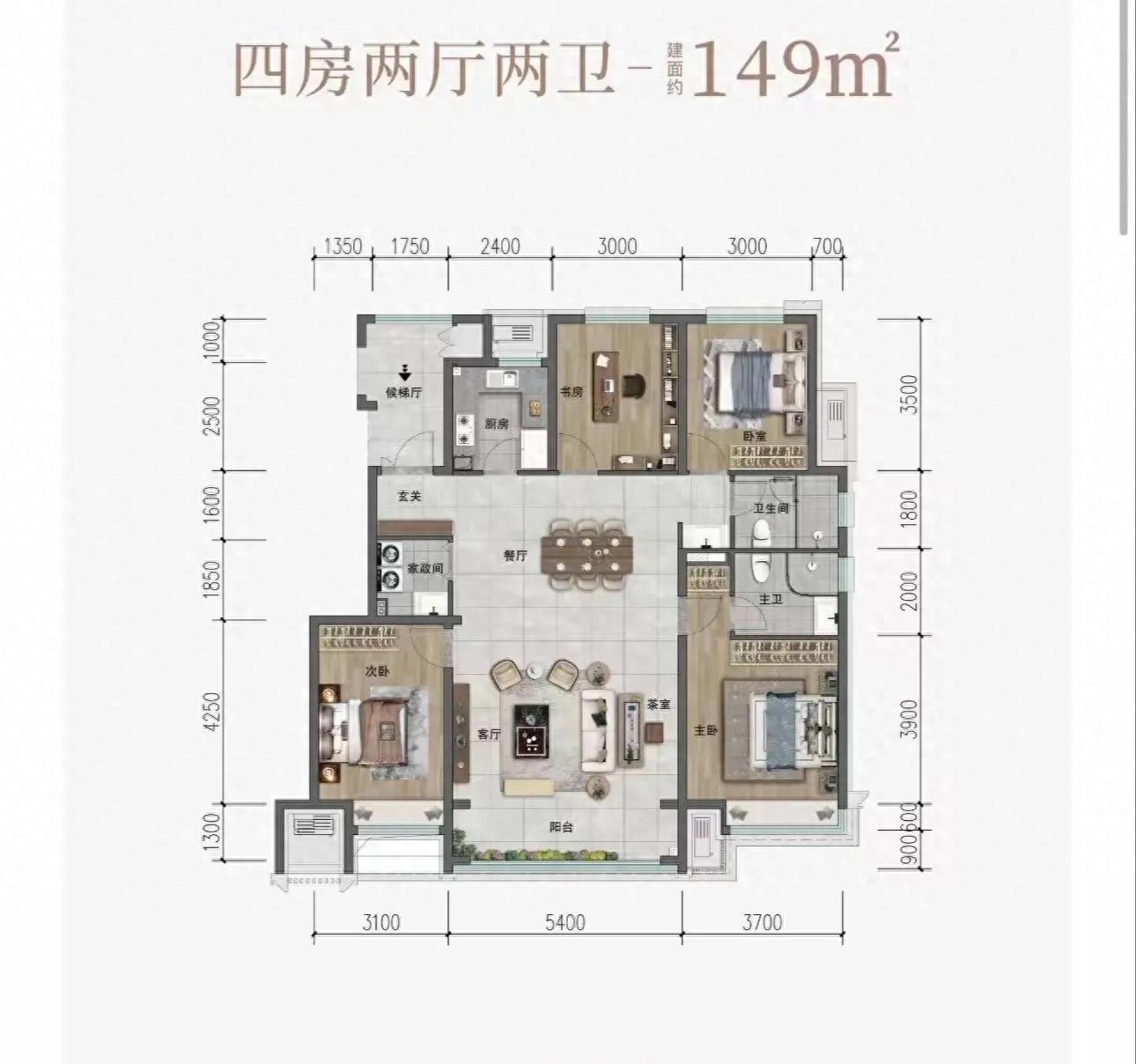 148.56㎡的户型做出通透大气的效果,关键在格局的合理规划。南向双卧室分列两侧,中间无遮挡,保证了各自的采光独立性。日常使用中,主卧与次卧分别供长辈与儿童居住时,互不干扰的布局能减少夜间走动带来的影响,且南向房间冬季日照充足,体感更舒适。