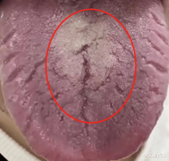 先来看第一个舌象,这个舌头上面布满了裂纹,并且横纹居多,舌中部分的最为明显,舌中对应的就是我们的脾胃,横纹呢说明是气机运行受阻了,脾胃为一身气机升降之枢纽,脾胃不通,体内的气机就会出现问题。这个时候呢,人就容易出现腹胀、嗳气、打嗝、反酸、烧心等脾胃不适症状,并且还容易疲惫,四肢困重,消化不好,大便不成型,非常黏腻,容易粘马桶等等,那这个时候就需要去打通脾胃气机,清理掉这些积滞为主了,可以参考一个木香顺气丸。