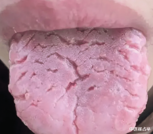 那还有的人舌头上的裂纹是竖着的,从舌根向舌尖延伸开来,并且舌前半部分的舌质明显发红,这就是体内的阴液不足所致,就像土地缺水会干旱开裂,我们体内的津液不能输布到舌面上去濡养舌面,舌头就会出现这种竖状裂纹。那这类人一般会伴有一些阴虚症状,比如说口干咽干,五心烦热,失眠多梦,潮热盗汗,大便干燥如羊粪等等,那这个时候就要适当的补充一些津液,可以参考一个天王补心丹来滋补心阴。
