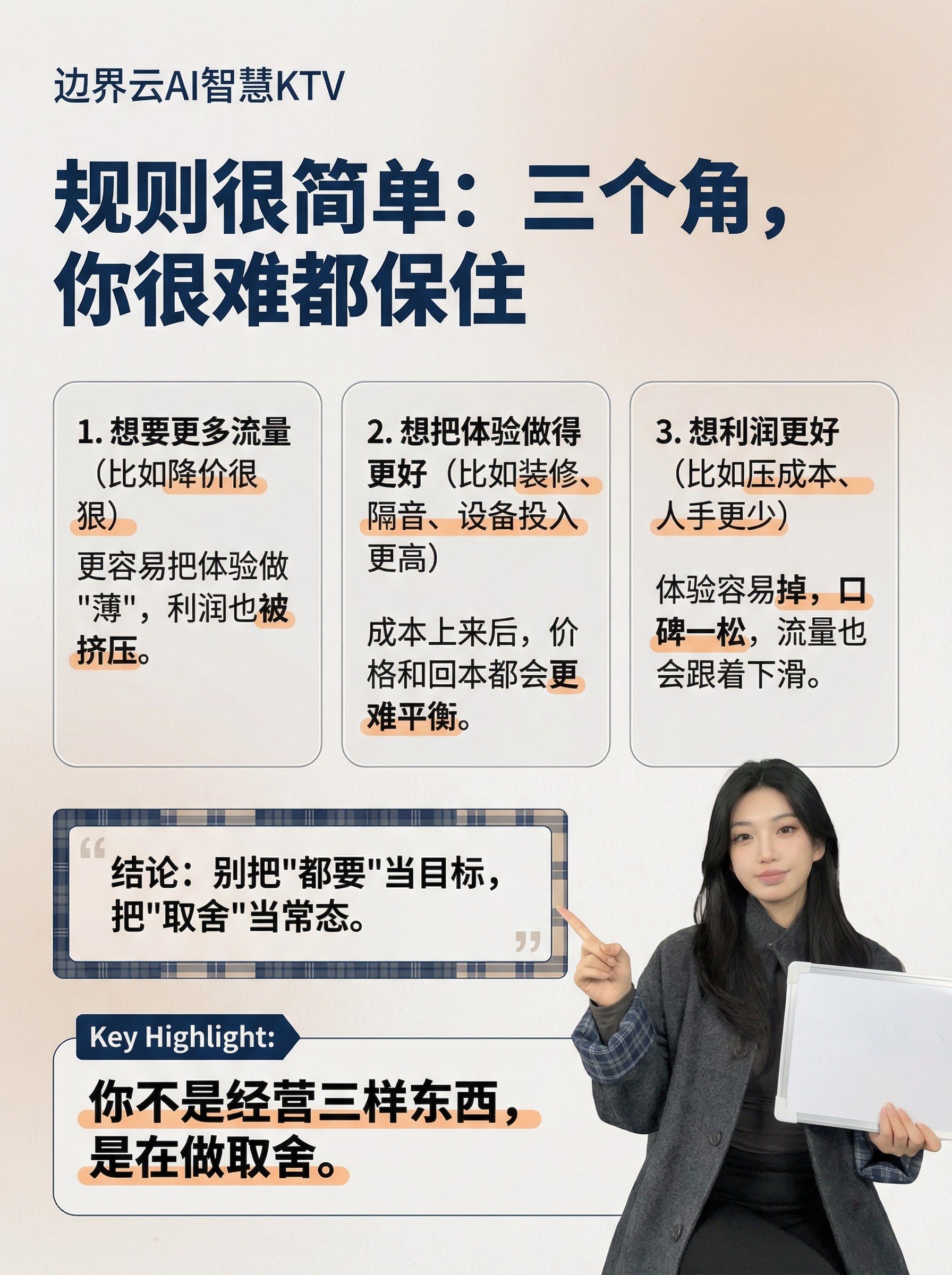 二、破局的路,不在"全要",而在"会换"既然不能同时要,那就得学会在不同时候要不同的东西。那些活得久的KTV,都不是硬撑着三样全抓,而是跟着淡旺季换重心。