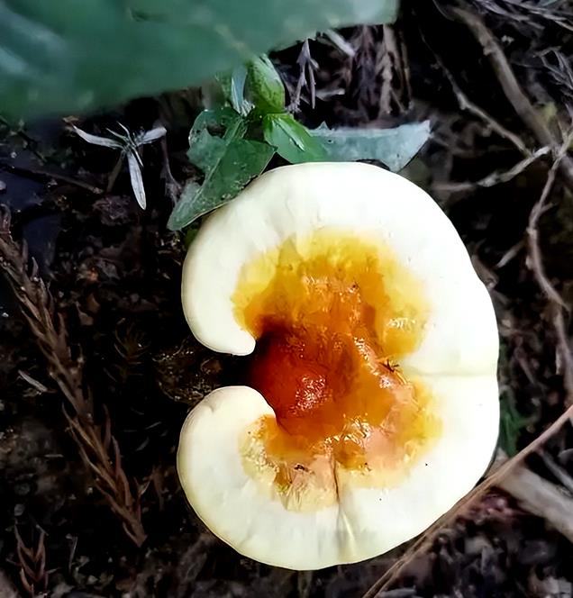 朋友好奇地走近仔细观察,心中不禁涌起一阵惊喜。凭借着对菌类的一些了解,他敏锐地意识到,这可不是一个普通的菌子,而是一株罕见的野生灵芝。