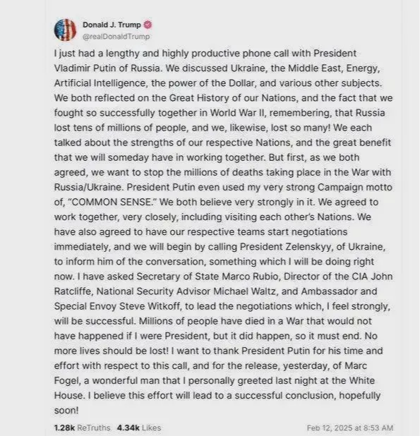 特朗普与普京的通话时间为90分钟,后他在自己的社交平台“真相”上发帖概括介绍了通话情况。