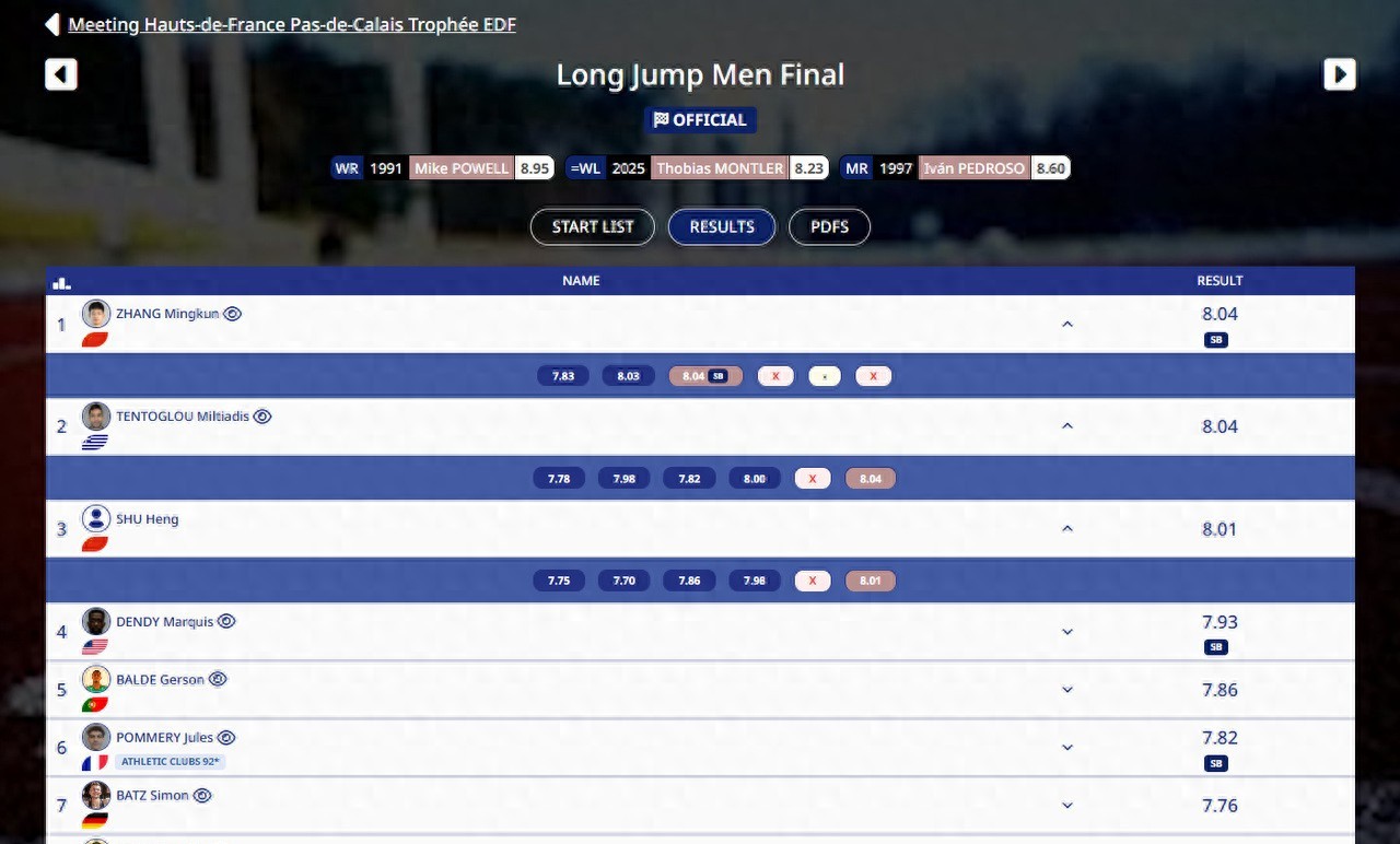 哇,你猜怎么着?咱们中国小伙子张溟鲲,在法国列万站的世界田联室内巡回赛上,男子跳远项目,直接把巴黎奥运会的冠军给KO了!这消息是不是够劲爆?他跳出了8米04的好成绩,这可是实打实的金牌啊!这比赛太精彩了,简直比电视剧还精彩!