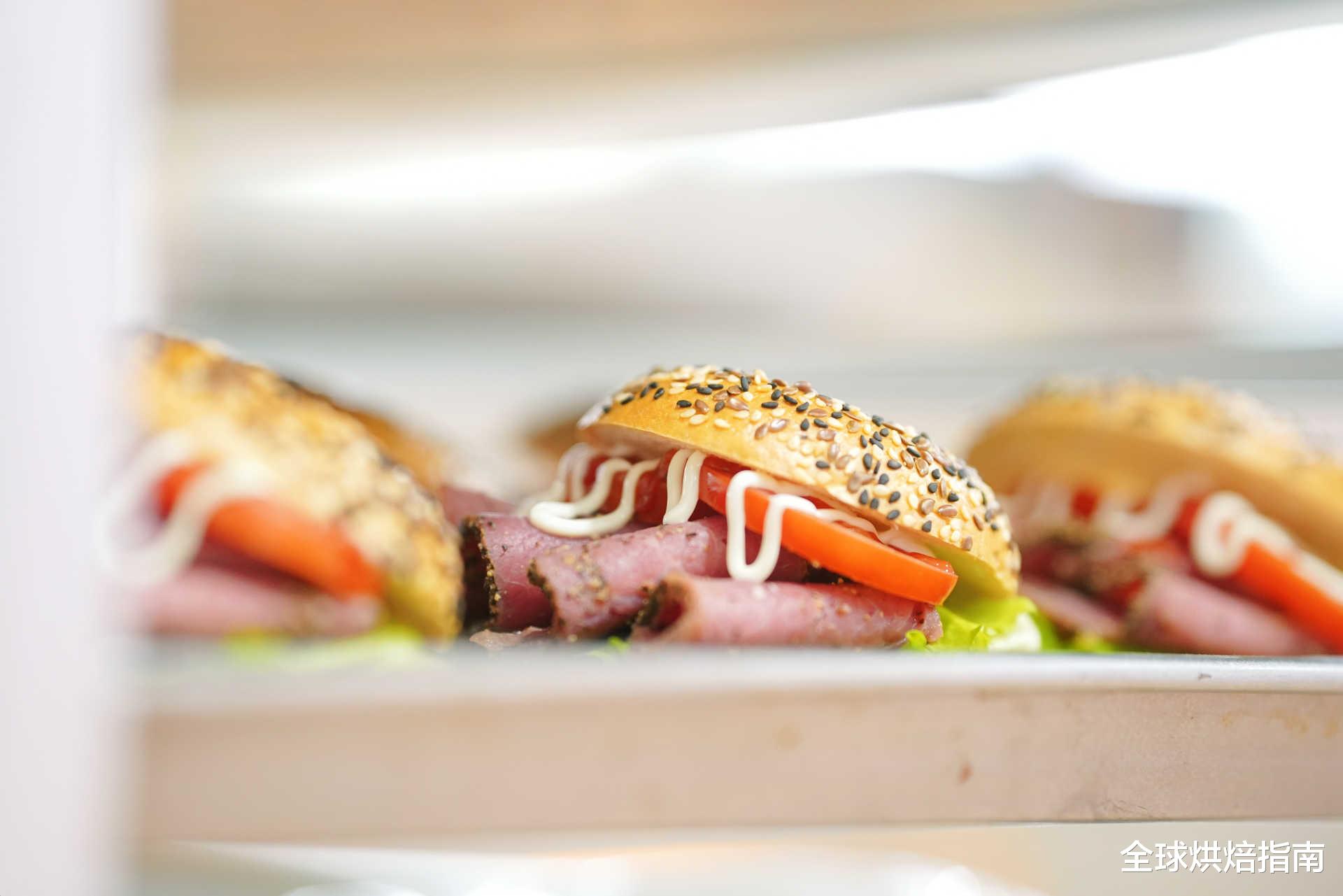 采用大成明星产品黑椒牛肉切片。黑椒独特的辛香气息,与鲜嫩牛肉天然肉香相互交融,赋予贝果浓郁且富有层次的味觉体验,再融入酸甜番茄,中和黑椒的辛辣,增添清爽口感,芝士片醇厚奶香。贝果结构紧实有韧性,方便手持,可轻松作为早餐,迅速补充能量;也能作为午餐,提供饱腹感与丰富营养,还可在下午茶时与咖啡搭配,缓解疲劳。