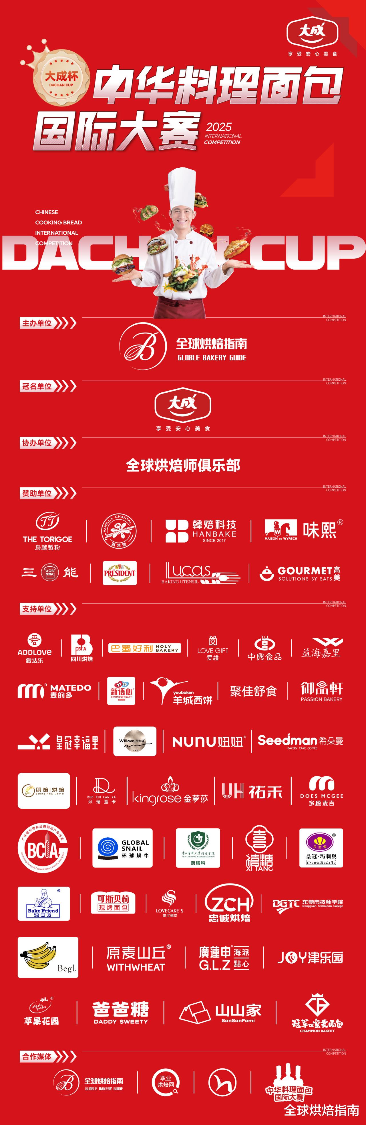 本次本赛是由总冠名大成食品,以及各个赞助商:鸟越制粉、香梵迪香草、韩焙烤箱、味熙专业乳品、三能器具、总统、卢卡斯、高美等合作伙伴的慷慨支持。再次感谢各品牌对大赛的支持!