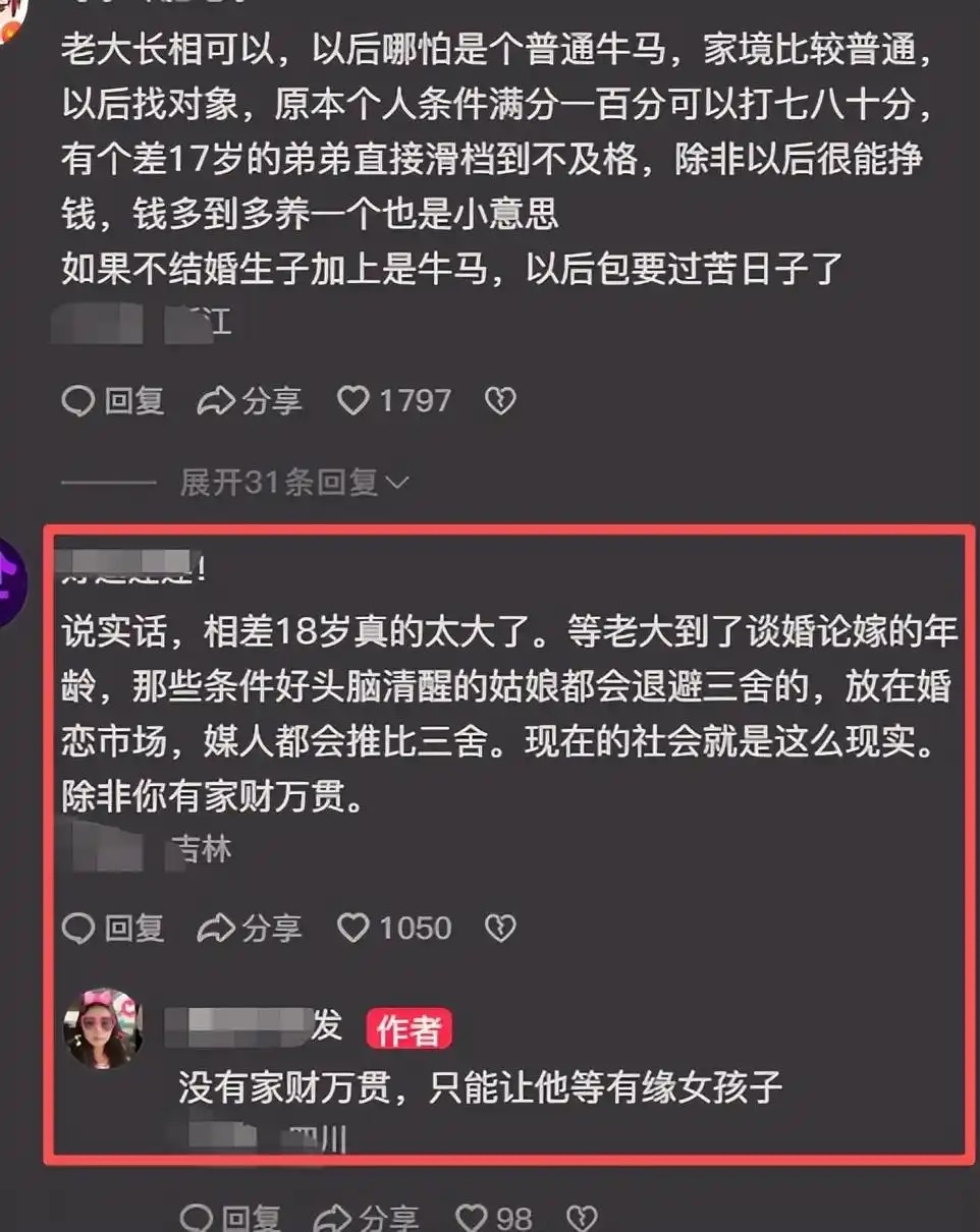 而这位家长在看到了评论区这么多大实话后,表面上不动声色,实则内心已经破防了,否则她也不会说出那句——“没有家财万贯,只能让他等有缘的女孩子”了。
