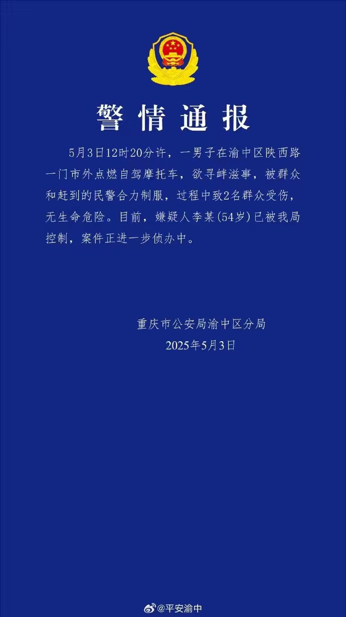 重庆市公安局渝中区分局警情通报:5月3日12时20分许,一男子在渝中区陕西路一门市外点燃自驾摩托车,欲寻衅滋事,被群众和赶到的民警合力制服,过程中致2名群众受伤,无生命危险。目前,嫌疑人李某(54岁)已被我局控制,案件正进一步侦办中。