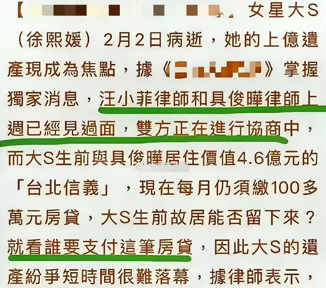 这套豪宅市值过亿,地理位置优越,内部装修奢华,是大S与汪小菲婚姻期间的共同住所。离婚后,房产归属问题成为双方争议的焦点。最终,豪宅判归大S所有,但30年期的巨额房贷却成了一个棘手问题。据媒体报道,每月高达百万台币(约合23万人民币)的房贷压力,如今落在了具俊晔肩上。