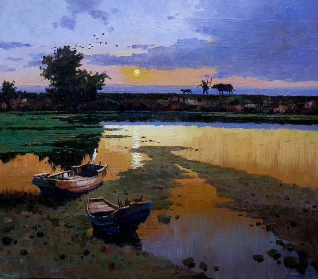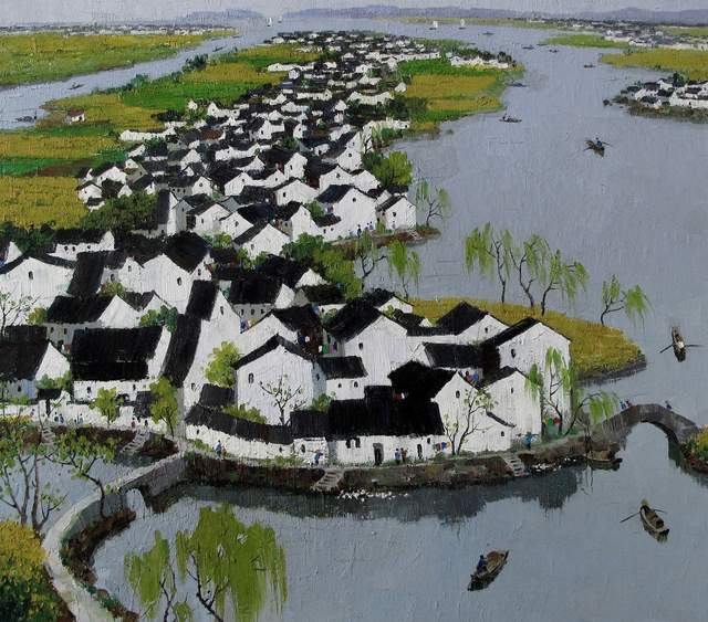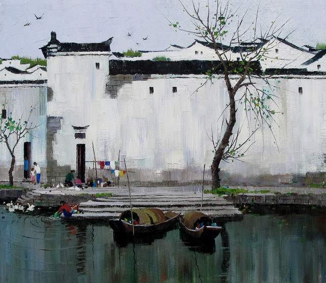然而,无论走得多远,故乡始终是他创作灵感的源头活水。皖南的粉墙黛瓦、桨声灯影、蒙蒙烟雨,早已化为其艺术DNA中不可或缺的片段。他承继先师“到人民中去、到生活中去”的嘱托,数十年来潜心以江南水乡为母题进行深耕。在张振家的画笔下,江南不再是单纯的风景再现,而是升华为一种文化符号与精神家园的象征。他巧妙地将水墨画中“气韵生动”、“虚实相生”的美学原则,与油画丰富的色彩表现力和立体塑造感相结合,创造出一种既熟悉又新颖、既民族又世界的视觉诗篇。这种“东方意境,西法呈现”的独特风格,逐渐成为其作品中辨识度极高的艺术指纹。