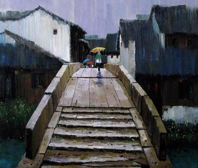 在技法层面,他突破了媒介的界限。其油画作品,远观色彩饱满、层次丰富、光影交织,尽显西洋油画之厚重与表现力;近睹则可见笔意流淌、墨韵宛然,勾勒晕染间深得中国书画笔法之精髓。他对画面“空灵”感的营造,对“意境”而非单纯“实景”的追求,使得其作品在写实的框架内,洋溢着浓厚的象征意味与诗性哲学。如水乡常见的“桥”,在其画中不仅是连接两岸的建筑,更隐喻着古今对话、中外沟通的通道;那氤氲的“水气”,既是江南地理特征的描摹,也是时光流转、文化浸润的视觉化表达。