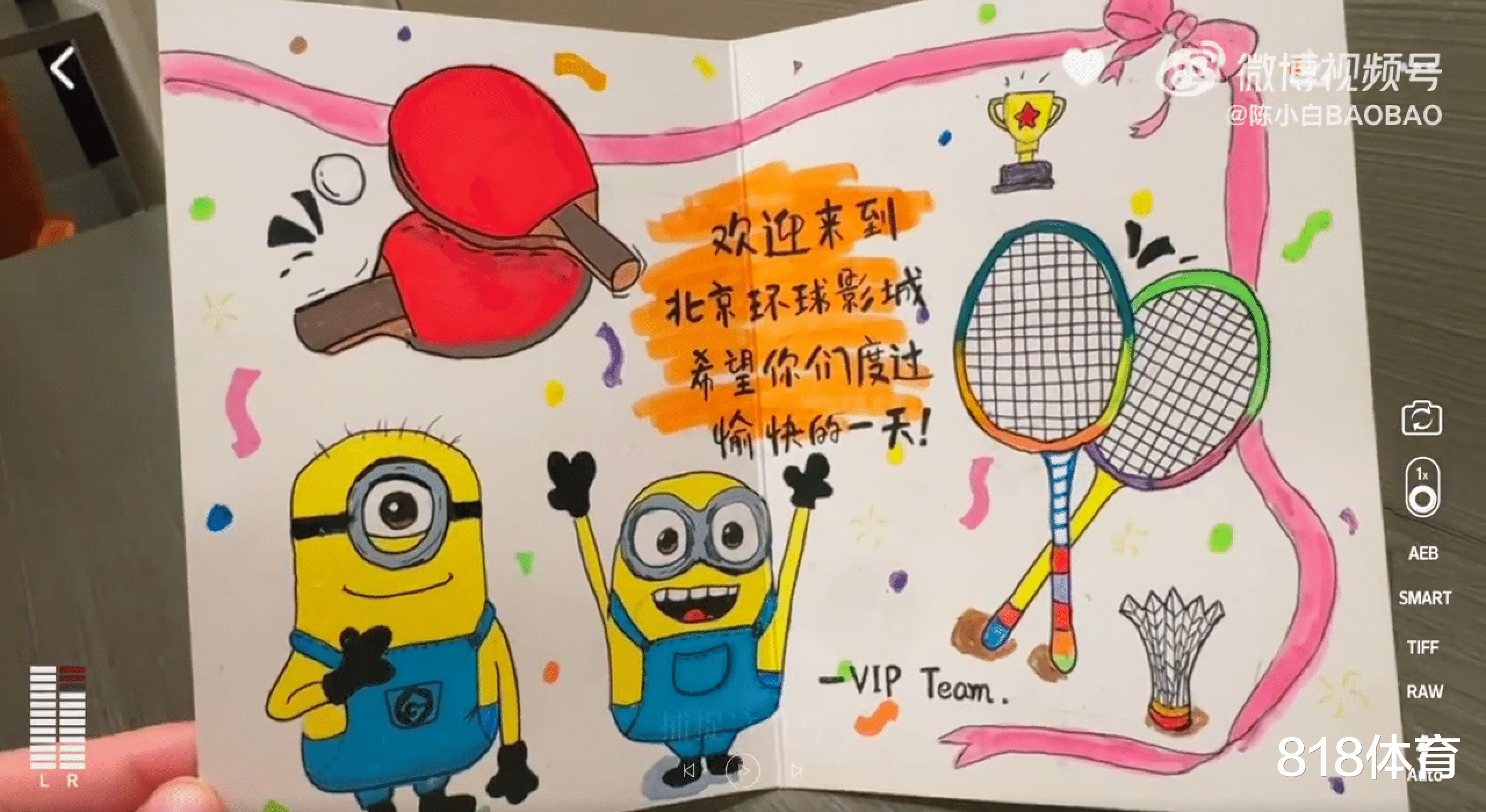 最后,陈清晨晒出了主办方为她们特别准备的欢迎卡片,上面有乒乓球、羽毛球,还有奖杯和小黄人,十分贴心!
