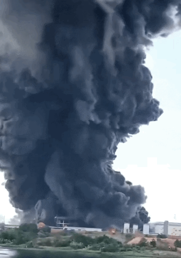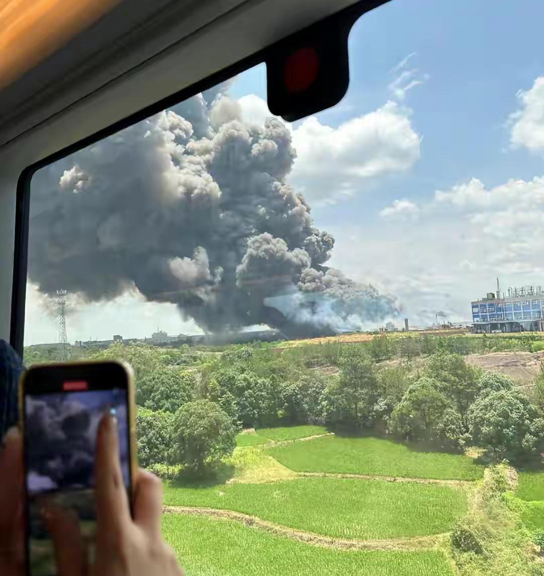 爆料的视频画面显示,火灾发生的工厂位于一条公路旁,升起的滚滚黑烟高达几百米,几公里外的居民都能清晰地看到,大火甚至将旁边的公路吞噬。视频中还有一辆小汽车孤单地从即将被大火吞噬的公路中逃离,还有人大喊着不要过来。