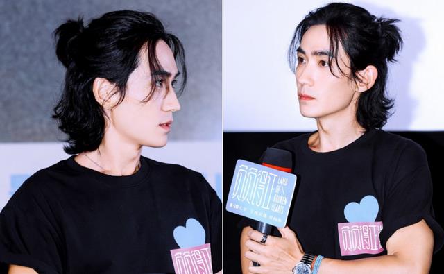 在电影的发布会现场,他还做了一个扎着小揪揪的长发造型。