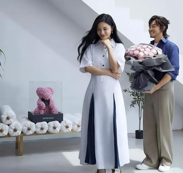 在他晒出的照片中,他绅士地捧着一束玫瑰花,深情地望向他的妻子。