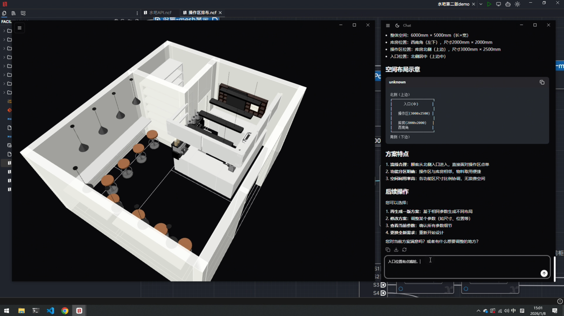 更重要的是多轮迭代的动态适配力。设计是持续优化的闭环,过去修改需求需完全依赖手动调参,效率低下;而现在,大模型支持连续对话式优化,能结合历史方案自主调整方向,生成优化后的方案,若对细节参数不满意,可直接通过手动调参修正。比如用户提出“操作区放在库房东侧”且“宽度需精准到2600mm”,大模型可先调整位置,再由用户手动固定宽度参数,全程无需重复输入基础信息,让迭代更高效。