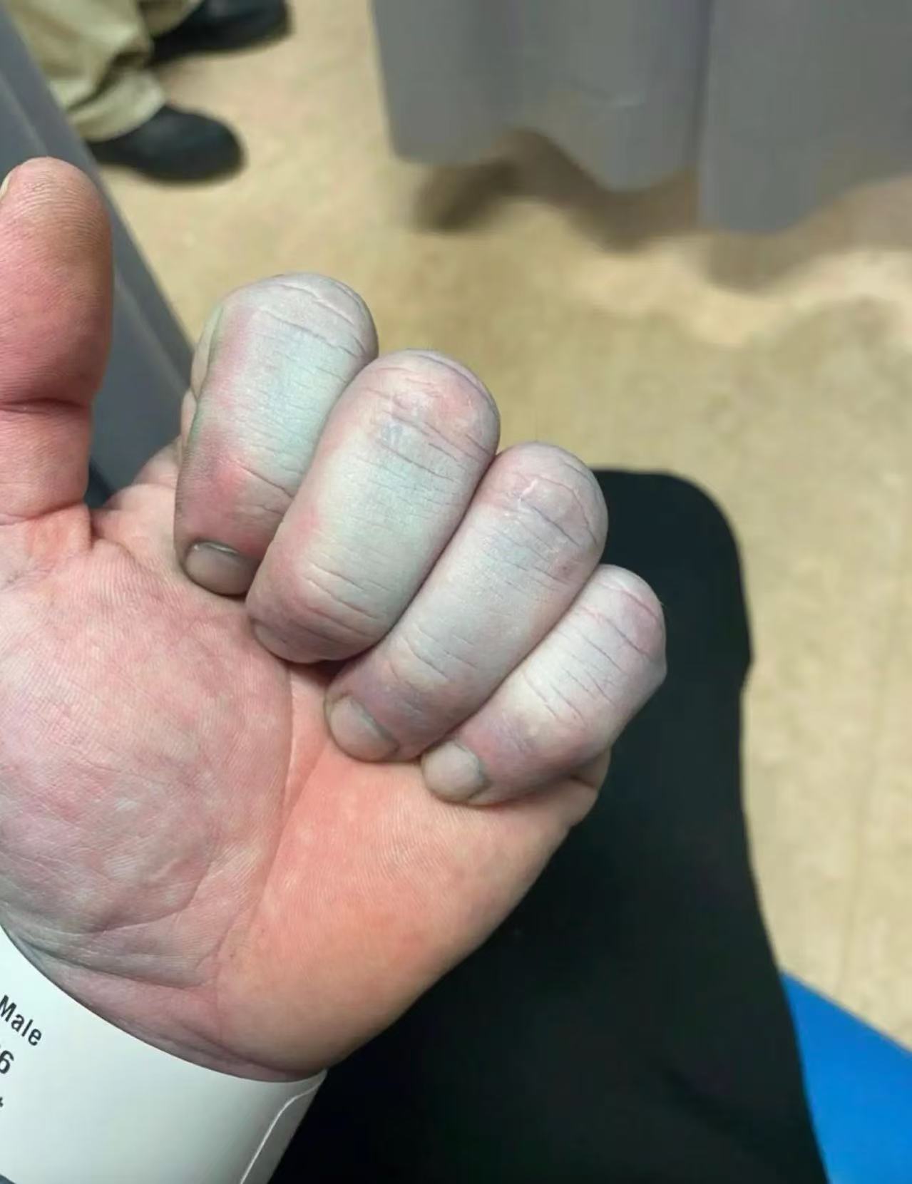 医护人员见状瞬间紧张起来,毕竟这样全身变蓝的情况,在急诊室也是闻所未闻。几分钟内,汤米就被安排了病床,吸氧设备立刻架上,前后有近10名医生围在他身边,翻来覆去地检查身体、询问症状,连血压、血氧、血常规都查了个遍,可所有检查结果都显示一切正常,这让医生们满脸疑惑,一位医生直言:“行医这么多年,从没见过有人蓝成这样,还各项指标都没问题的。”就在所有人陷入困惑,甚至开始猜测是不是罕见的皮肤病变时,一位医生随手拿起酒精棉片,在汤米的胳膊上擦了一下。下一秒,神奇的一幕发生了 —— 棉片染上了深蓝色,而他胳膊上被擦过的地方,竟露出了原本的肤色!