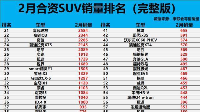 在SUV销量榜上,从第11到第15名分别是威兰达、皓影、逍客、宝马X3和大众探歌。威兰达销量刚过七千大关,皓影和逍客则都是六千多一点。宝马X3这次没挤进前列,探歌的成绩还算过得去,二月卖了四千多辆车。还有啊,沃尔沃XC60排在第16,宝马X5更靠后,只排在第18。汉兰达虽然稳在前20,但二月销量也少了。皇冠陆放、奥迪Q3、奇骏、凯迪拉克XT5和途昂这些合资SUV,二月都只卖了两千多辆。