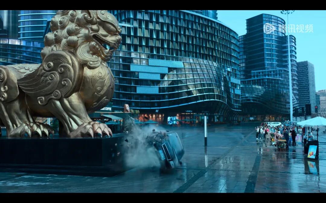一辆高速行驶的汽车,疯狂撞向鹏来广场的石狮雕塑。